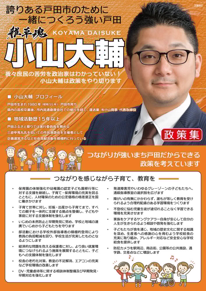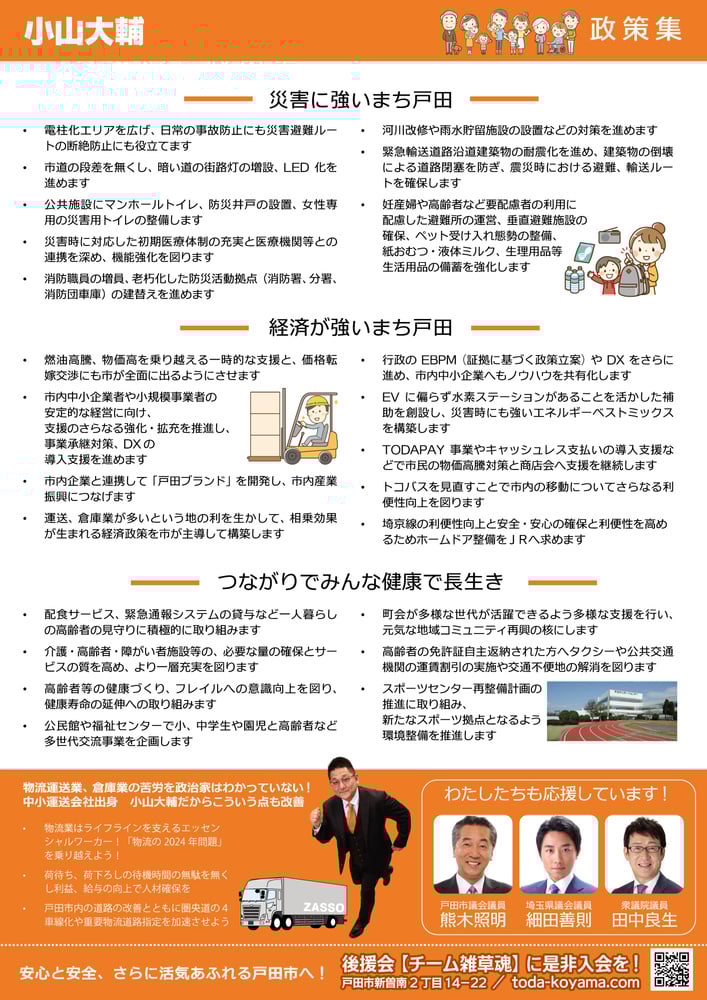 1「コロナが明けても地域に元気が戻らない!」 ⚫︎先輩世代へ 要支援、介護におせわにならずに健康でいられる時間を増やします! ⚫︎現役、子育て世代、市内企業へ 圧倒的なサポート体制の強化、市内企業支援で経済成長、手取り向上させます! ⚫︎こども未来世代へ いじめ、虐待は許さない。世界に通用する人財育成プランを提供します! |